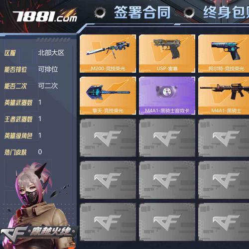 【可二次 英雄武器数量:1 英雄角色数量:1 王者武器数量:1 电竞教官云悠悠 M4A1-黑骑士音效卡 稀有武器:3个 挑战号,爆破号】北部战区 编号BB1207 VIP2【可二次**】【可排位】 【大师段位】 ID派派派头子【荣光M200+白虎+源QBZ+USP雷暴】 【CF点550】【V武器数42】【竞技荣光套装X10套】【M200-竞技荣光】【USP-雷暴】【柯尔特-竞技荣光】【电竞教官-云悠悠】【修道士】【M4A1-雷神】【雷神-烈虎皮肤】【雷神-机甲刑天皮肤】【火麒麟-CFSTAR】【火麒麟-雷神】【M4A1-黑骑士】【黑骑士-摸金校尉】【M4A1-黑骑士音效卡】【毁灭-风暴】